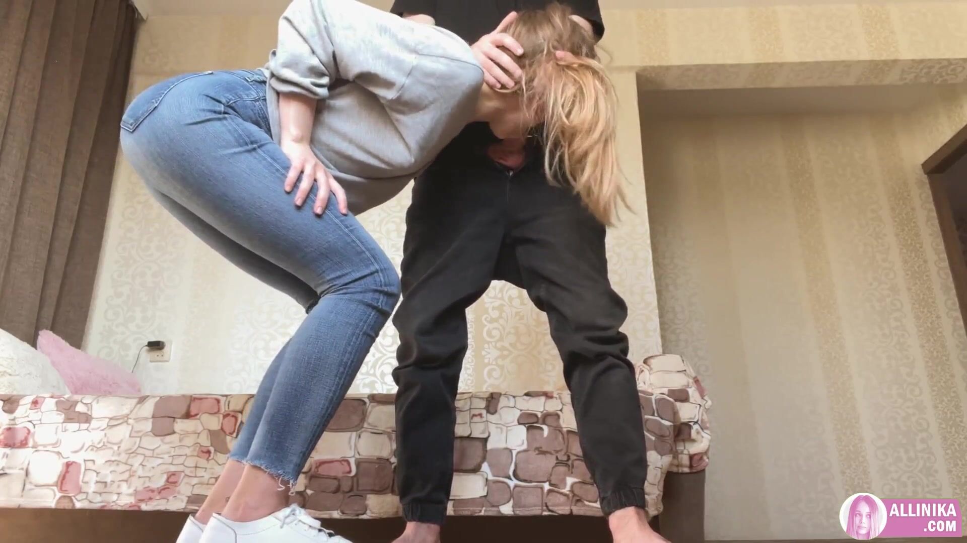 Allinika красуется перед парнем в новых джинсах. Они так жестко обтягивают аппетитный зад девушки, что кажется, будто еще немного и они разойдутся по швам. Чтобы лучше протестировать покупку, бойфренд предлагает красотке присесть на корточки возле его ног. Шлюха сразу просекает желания самца и расстегивает ему ширинку. После минета новенькие джинсы были приспущены, и в пизду отправилась твердая палочка-выручалочка, которой хорошо знакома эта влажная пещерка.